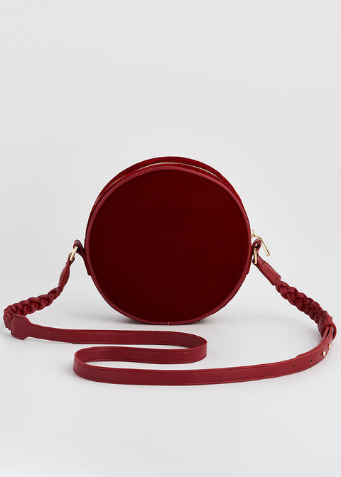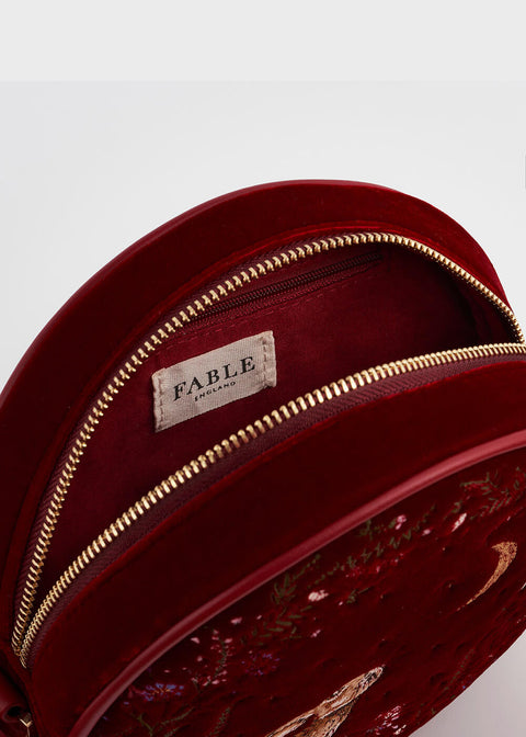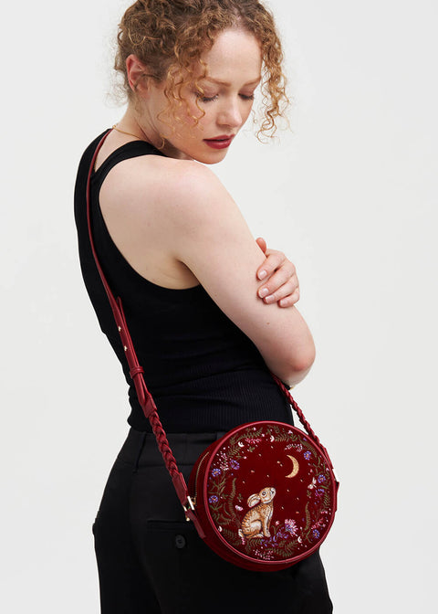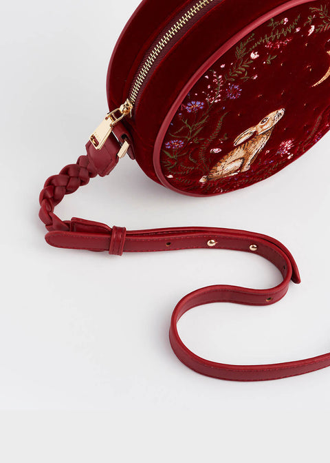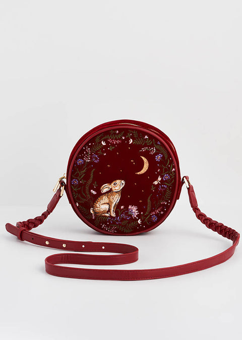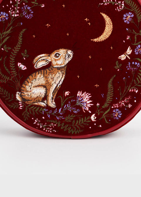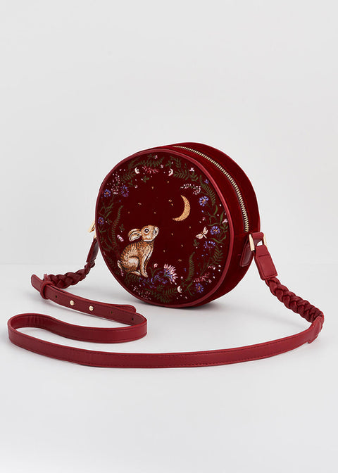 Fabelachtig prijkt ze op het wijnrode fluweel: een konijn, starend naar de maan, allemaal zo fijntjes is geborduurd dat het je adem wegneemt... Deze retro-tas is gevoerd met haar 20 cm breed ruim genoeg voor je belangrijkste spulletjes als een telefoon en portmonnee. Zo'n schoonheid hopt toch zo jouw winkelmandje in?