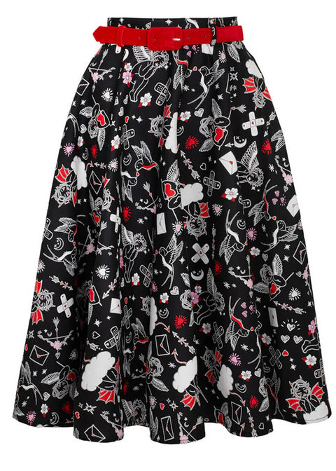 De Charlie Skirt is een klassieke 50’s circle skirt met een zwarte basis vol dromerige cherubs, zwaluwen, hartjes en bloemetjes. Mét zakken en een rode riem om je taille extra te laten knallen, en met haar echte volle cirkelrok zal jij het niet kunnen laten om rondjes te draaien. Goed nieuws: niemand houd je tegen 🖤