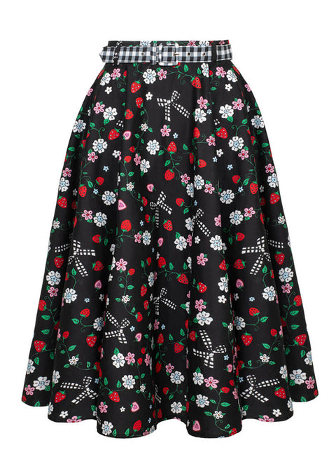 Deze 50’s swing rok heeft een zwarte basis vol vrolijke aardbeitjes, kleine bloemetjes en speelse strikjes — en natuurlijk een bijpassend gingham riempje om je taille extra in the spotlight te zetten. Met haar echte volle cirkelrok wil je maar één ding: draaien. Goed nieuws… niemand houdt je tegen 🖤
